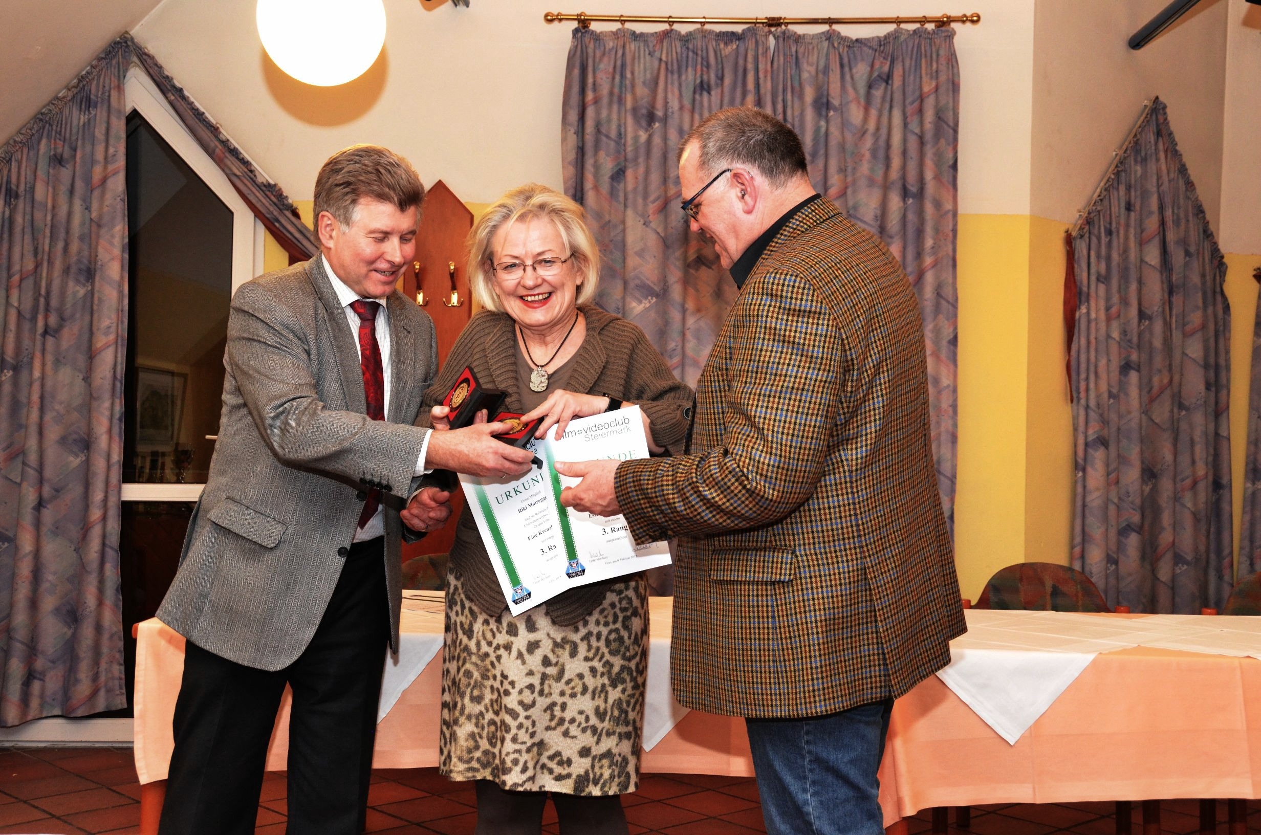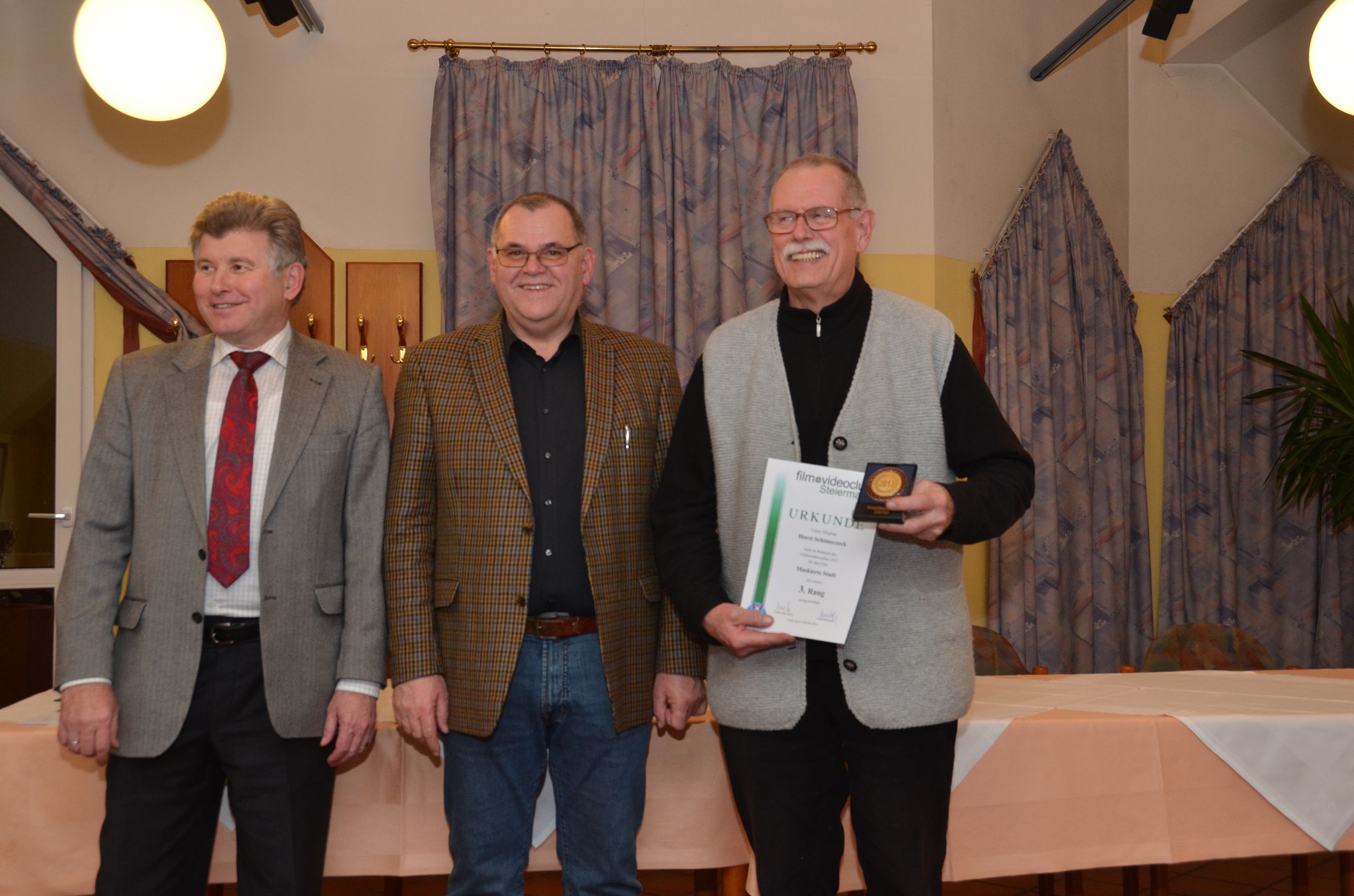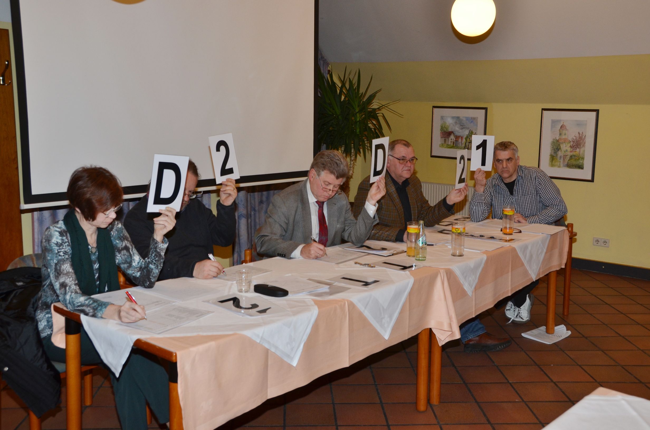 Dann hieß es „Licht aus“ und unter der Regie von Manfred Strasser, der vorher alle Filme in seinen „Silberapfel“ gespeichert hatte, startete der Wettbewerb. Es wurde ein Programm frei nach dem Motto „quer durch den Gemüsegarten“ geboten. Dokumentationen, Reportagen, Reisefilme und ein Spielfilm waren genannt worden. Nach acht Filmen wurde die Vorführung zwecks Einnahme des Abendessens unterbrochen. Danach lief der zweite Filmblock. Anschließend sammelte Michael Moor die ausgefüllten Formulare der Publikumswertung ein. Die Spannung stieg, als die Jury mit der Besprechung der Filme einsetzte und nach jedem Film die Bewertungstafeln hoch hielt. Beim ersten Durchgang fiel nur die Entscheidung, welcher Film sich für die Landesmeisterschaft qualifizierte. Erfreulicherweise waren es zehn Filme. In der zweiten Bewertungsrunde wurden die Medaillen vergeben und der Clubmeister gekrönt, es wurde so wie im letzten Jahr Dieter Leitner, diesmal mit seinem Film “Klööhn – ganz nah“.