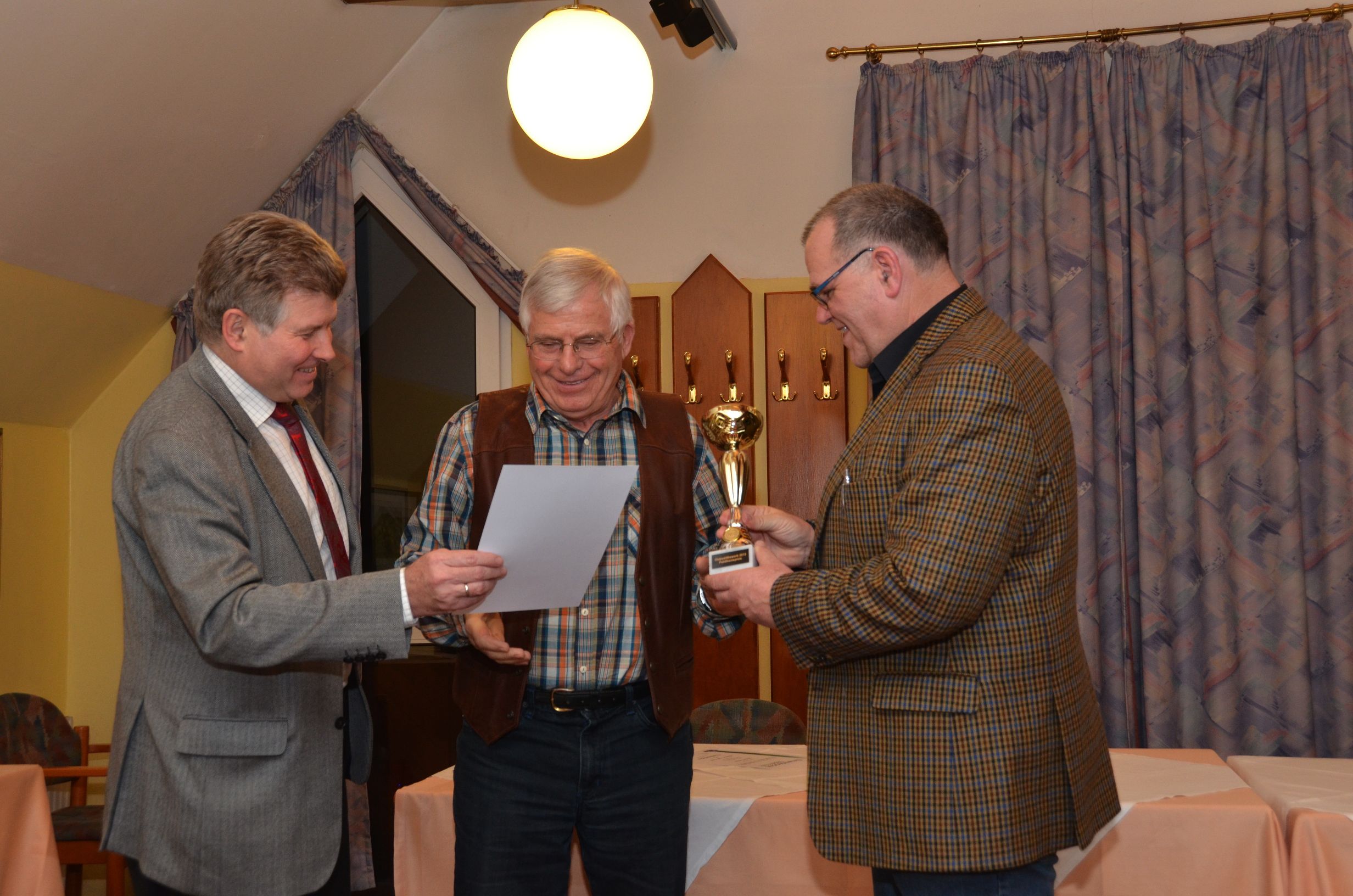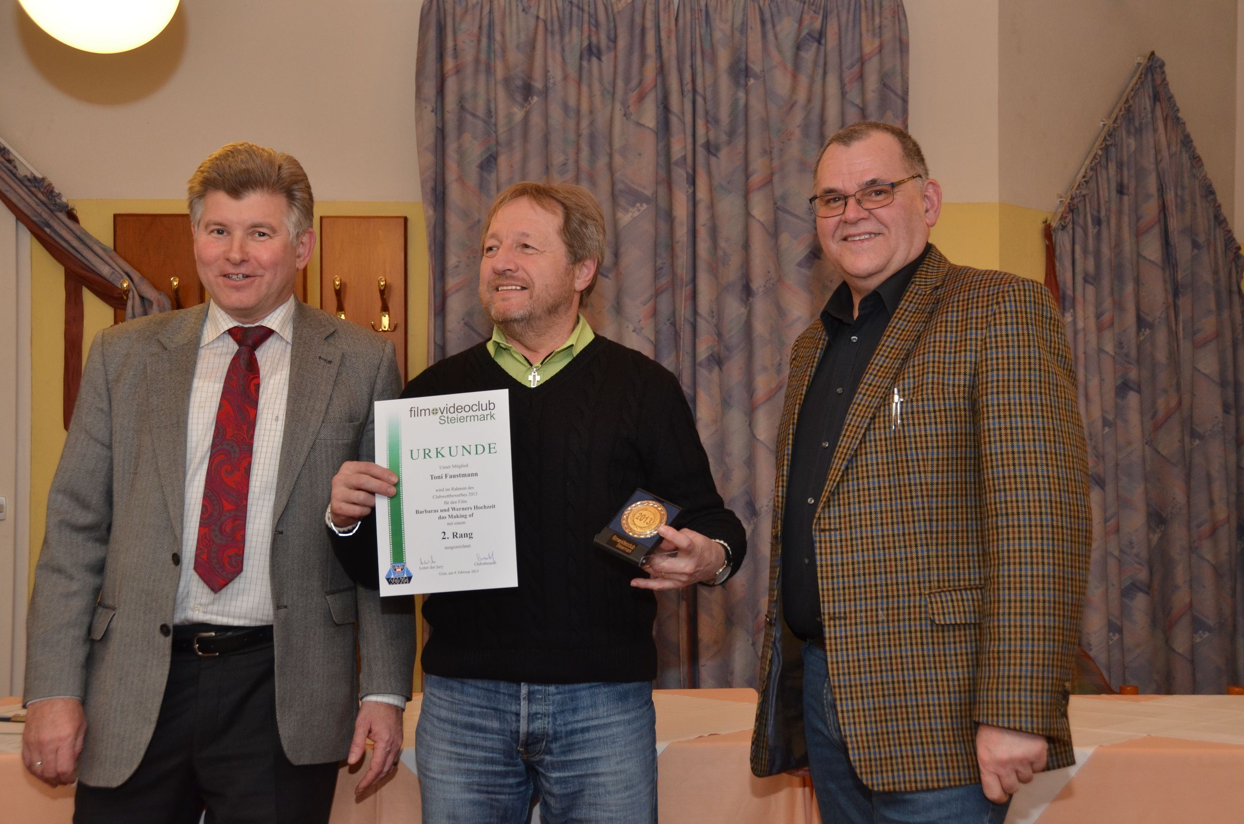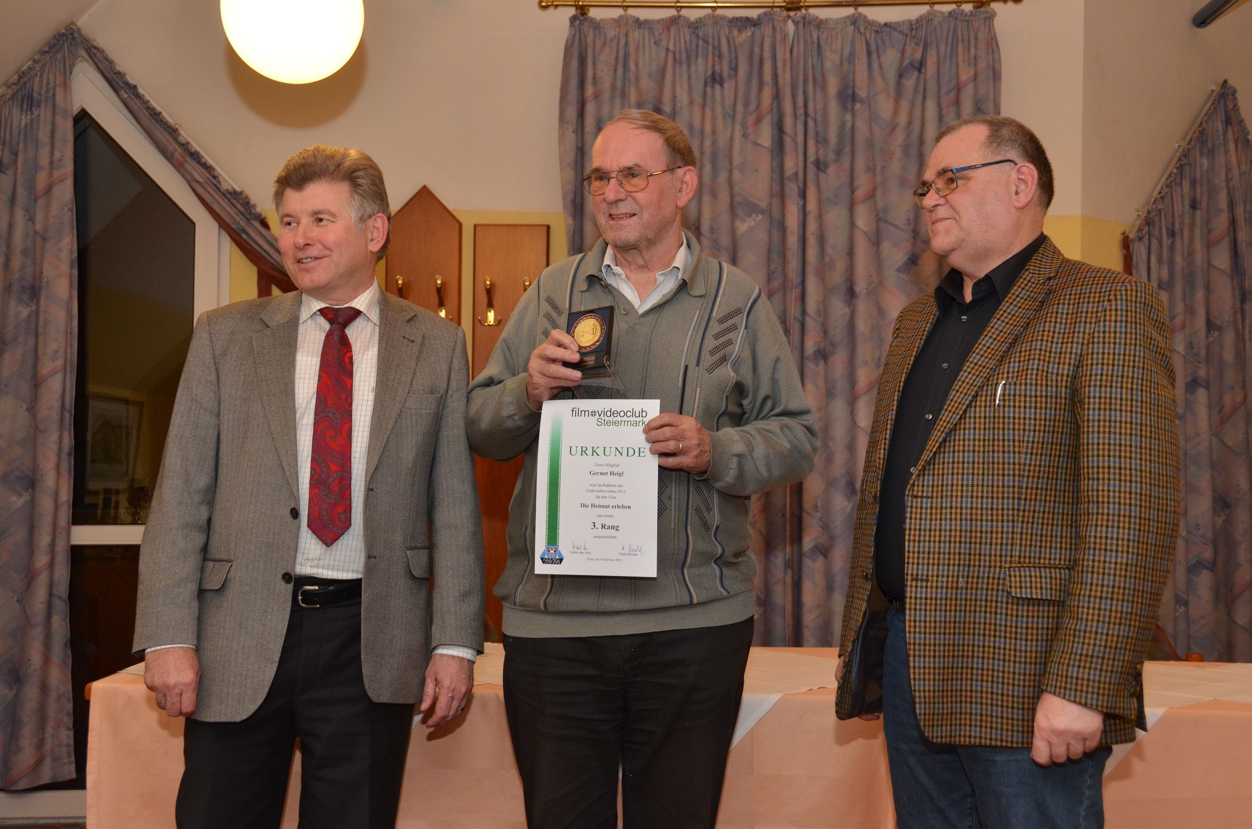 Dann hieß es „Licht aus“ und unter der Regie von Manfred Strasser, der vorher alle Filme in seinen „Silberapfel“ gespeichert hatte, startete der Wettbewerb. Es wurde ein Programm frei nach dem Motto „quer durch den Gemüsegarten“ geboten. Dokumentationen, Reportagen, Reisefilme und ein Spielfilm waren genannt worden. Nach acht Filmen wurde die Vorführung zwecks Einnahme des Abendessens unterbrochen. Danach lief der zweite Filmblock. Anschließend sammelte Michael Moor die ausgefüllten Formulare der Publikumswertung ein. Die Spannung stieg, als die Jury mit der Besprechung der Filme einsetzte und nach jedem Film die Bewertungstafeln hoch hielt. Beim ersten Durchgang fiel nur die Entscheidung, welcher Film sich für die Landesmeisterschaft qualifizierte. Erfreulicherweise waren es zehn Filme. In der zweiten Bewertungsrunde wurden die Medaillen vergeben und der Clubmeister gekrönt, es wurde so wie im letzten Jahr Dieter Leitner, diesmal mit seinem Film “Klööhn – ganz nah“.