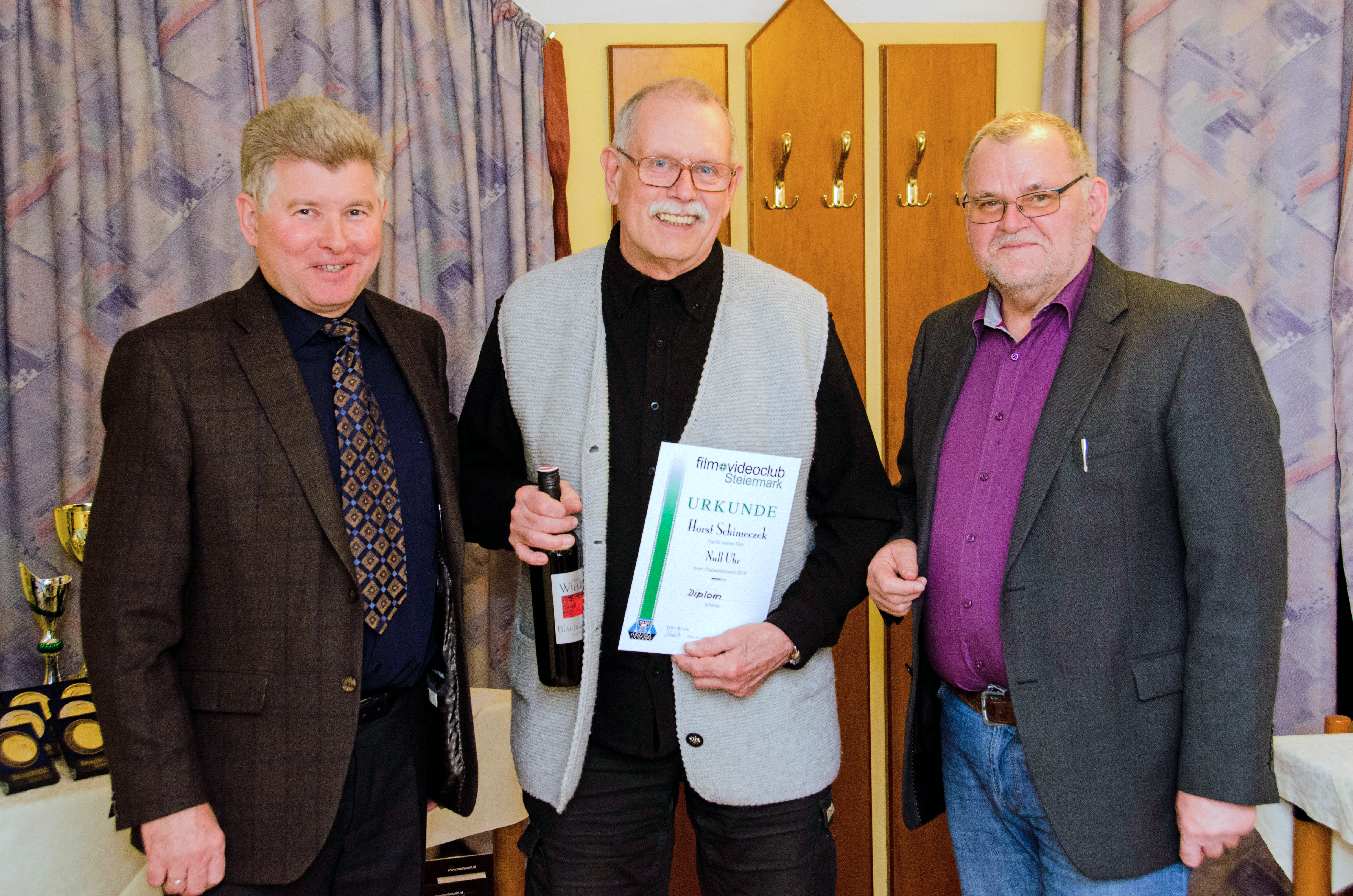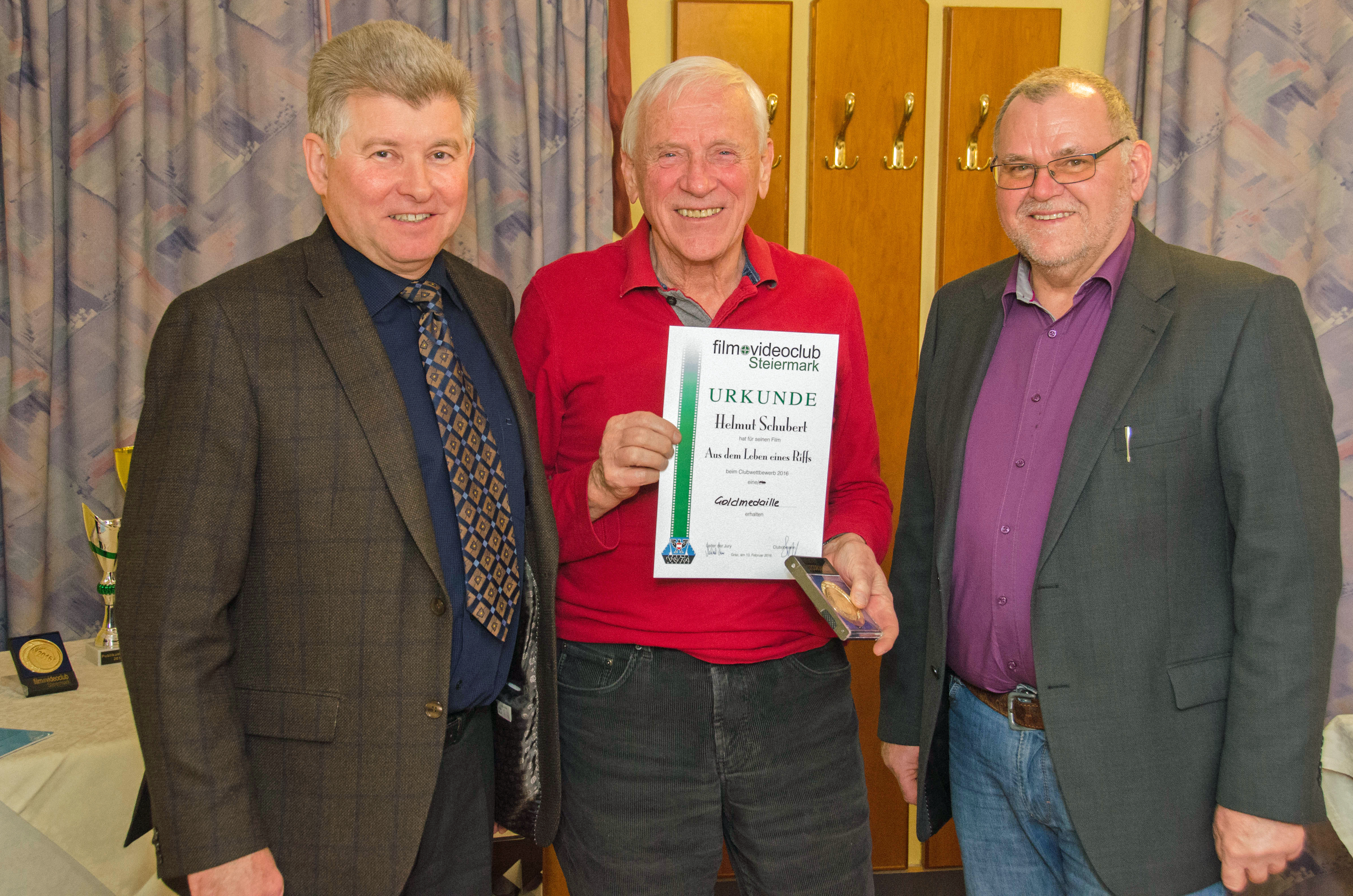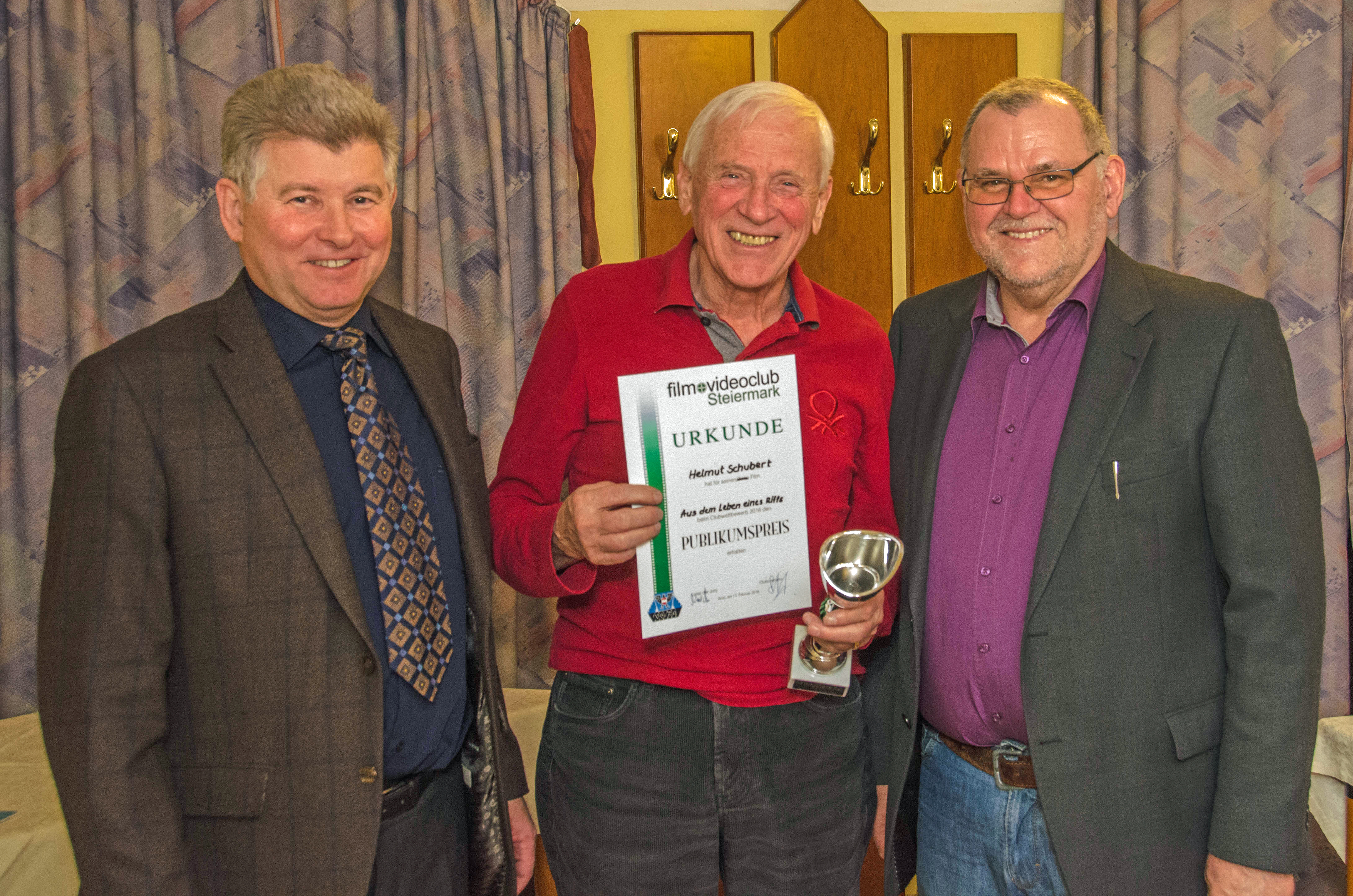 Nun folgte ein weiterer Höhepunkt des Abends: Die Auswertung der Stimmzettel des Publikumspreises. Nach Verlesung sind die Noten gleich in einen Laptop eingegeben worden. Alle konnten, wie immer über den Beamer auf die Leinwand projiziert, alles mit verfolgen. Nach spannendem Kopf- an Kopf Rennen zwischen den Goldmedaillen Gewinnern der Nr. 1 (Die Fremde) und der Nr. 3 (Aus dem Leben eines Riffs) konnte schließlich Helmut Schubert bei der abschließenden Preisverleihung den Siegerpokal des Publikumspreises unter großem Beifall entgegen nehmen.