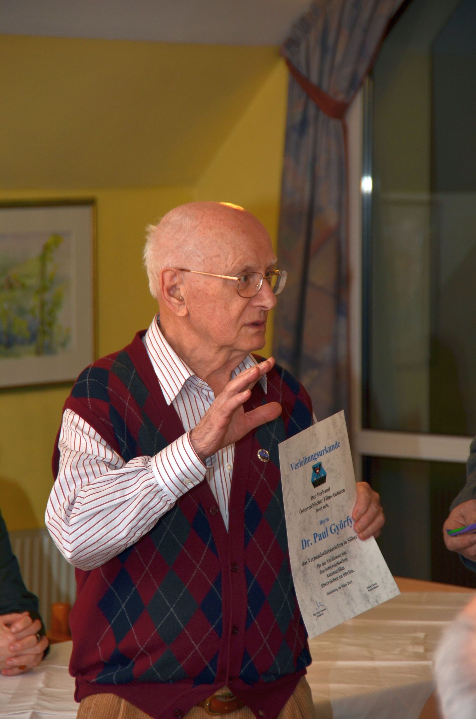 Wir kennen Dr. Paul Györfy als außergewöhnlichen Reisefilmer, wobei immer seine sehr ruhige Kameraführung auffällt, kein Wunder bei einem pensionierten Zahnarzt. Auch der Humor kommt bei ihm nicht zu kurz, mit seinen lustigen Kurzfilmen und den stets im Köcher befindlichen Witzen trägt er viel zur guten Stimmung im Club bei. Dr. Paul Györfy ist nun über vier Jahre in unserem Club, vorher war jahrzehntelang beim Filmklub Leibnitz Mitglied. Insgesamt filmt Dr. Paul Györfy bereits 40 Jahre, wie er in seiner Dankesrede erwähnte.