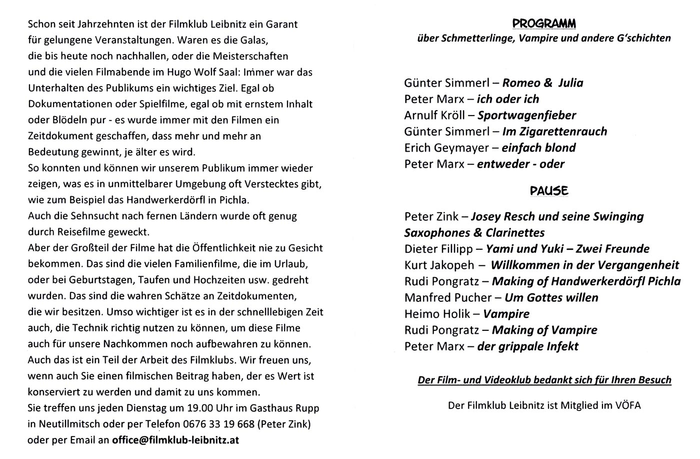Der Filmklub Leibnitz ist sehr aktiv. Wir kennen schon einige der gezeigten Filme aus der vergangenen Wettbewerbssaison aber es sind auch viele Neue dabei, die uns im kommenden Wettbewerbsjahr der VÖFA-Festivals wieder unterkommen werden. Es freut mich ganz besonders, dass der Filmabend so gut besucht ist. Der riesige Hugo-Wolf-Saal im Kulturzentrum Leibnitz ist bis zum letzten, noch schnell zusätzlich aufgestellten Stuhl voll besetzt. Wir verbringen einen schönen Abend gemeinsam mit filmbegeisterten Gästen und im Kreis unserer Verbandskollegen aus Leibnitz und haben viel Spaß, sowohl mit den Filmen als auch nachher, beim gemütlichen Zusammensitzen und pflegen der Kameradschaft mit Filmfreunden.