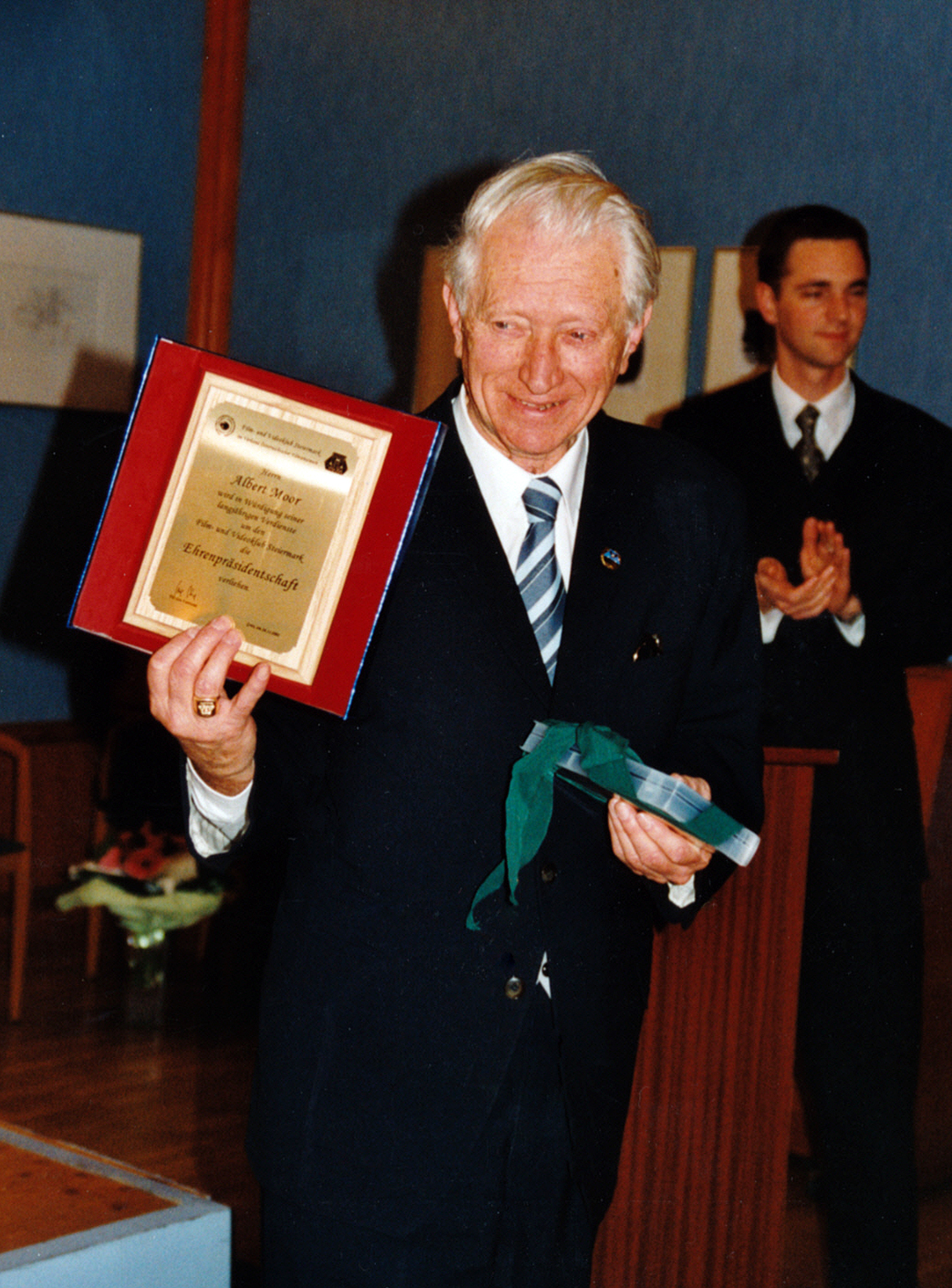 Im Hotel „Erzherzog Johann“, der ersten Heimstätte des Clubs, wurde eine Festveranstaltung organisiert, zu der ein Film namens „Stationen“ produziert wurde. Hier erzählte Gerlinde, seine Frau, mit der Albert über 66 Jahre verheiratet war, auf wundervolle Weise sein Leben mit all seinen Höhen und Tiefen. Interviews und Ausschnitte aus seinen Filmen bilden eine Einheit, deren Aussage heute noch aktuell ist, obwohl viele, der im Film vorkommenden Personen nicht mehr am Leben sind. In dieser feierlichen Veranstaltung erhielt Albert Moor den Titel „Ehrenpräsident“ verliehen.