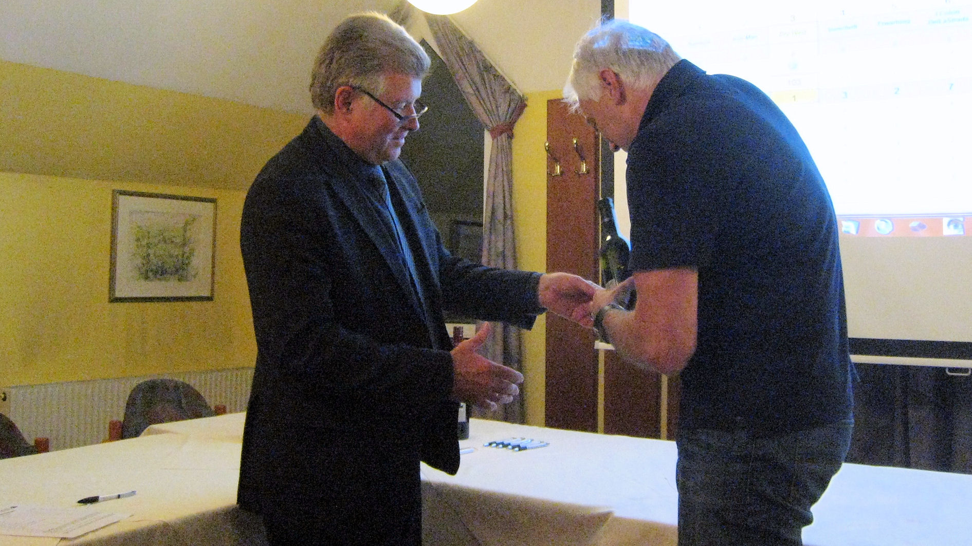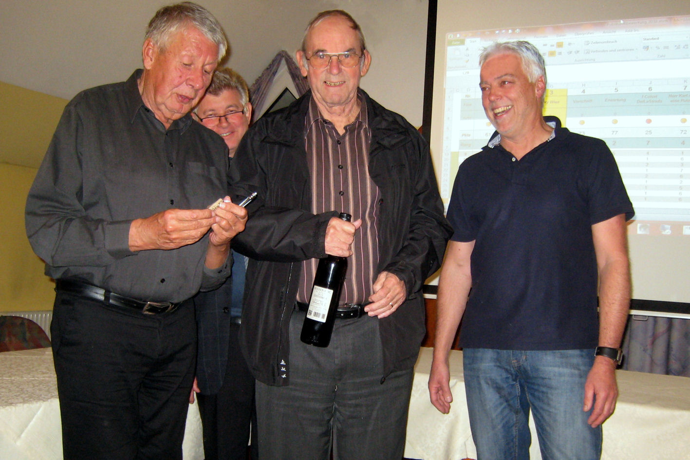 Vor der Auslosung der Vorführ-Reihenfolge wurden die Bewertungsbögen an die anwesenden Mitglieder ausgegeben, jeder musste die Filmtitel selbst eintragen. Dann hieß es „Licht aus“ und Manfred Strasser startete die Vorführung. Danach trugen alle ihre Benotungen in die Bewertungsbögen ein, was sich als sehr schwierig heraus stellte, alle Beiträge waren sehr kreativ und perfekt umgesetzt. Nun wurde es wieder spannend, als Rudi Bischoff von den eingesammelten Bögen Michael Moor die Bewertungen in den Laptop diktierte, die wiederum – wie bei uns üblich – über den Beamer von allen mit verfolgt werden konnten.