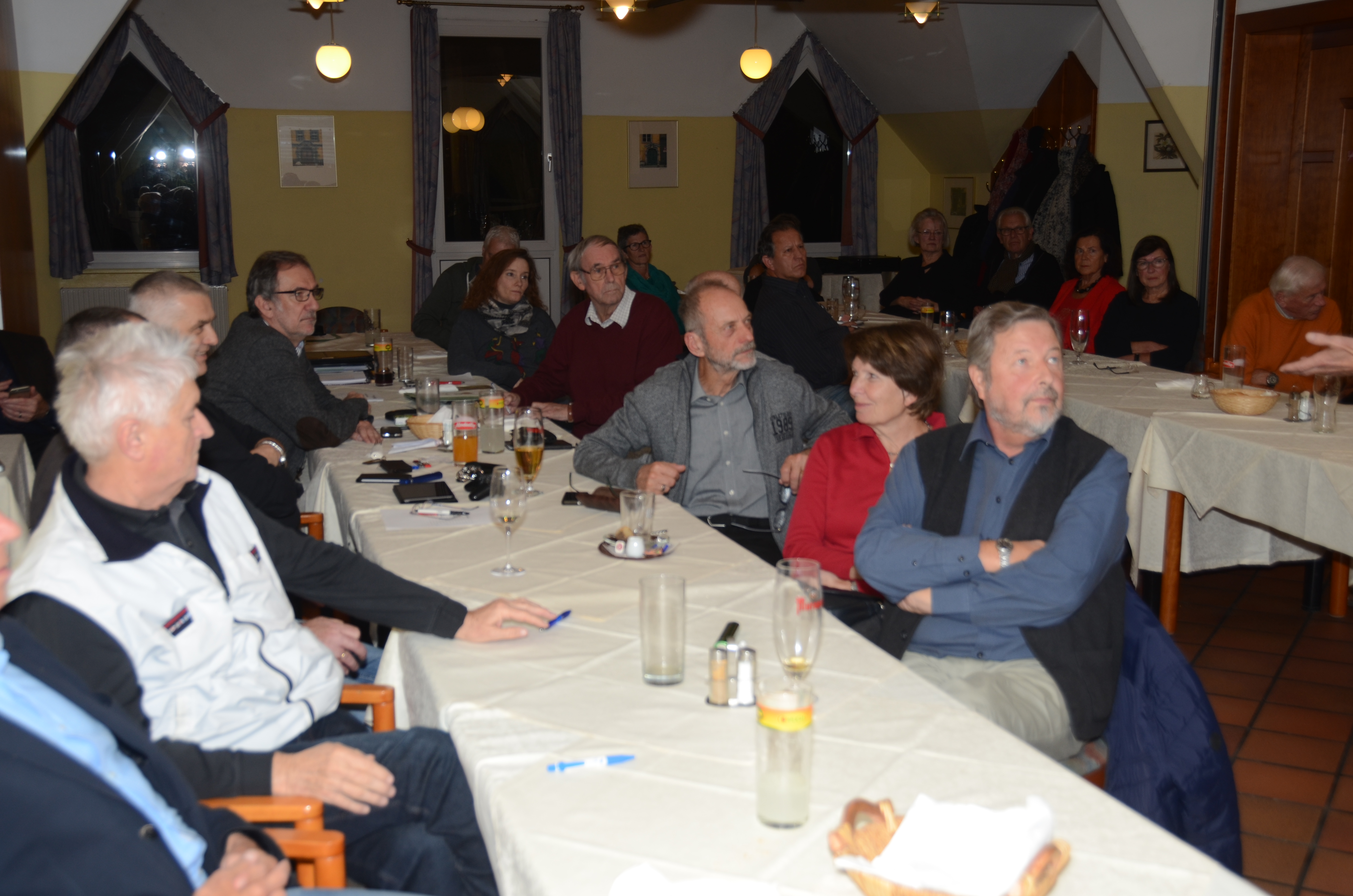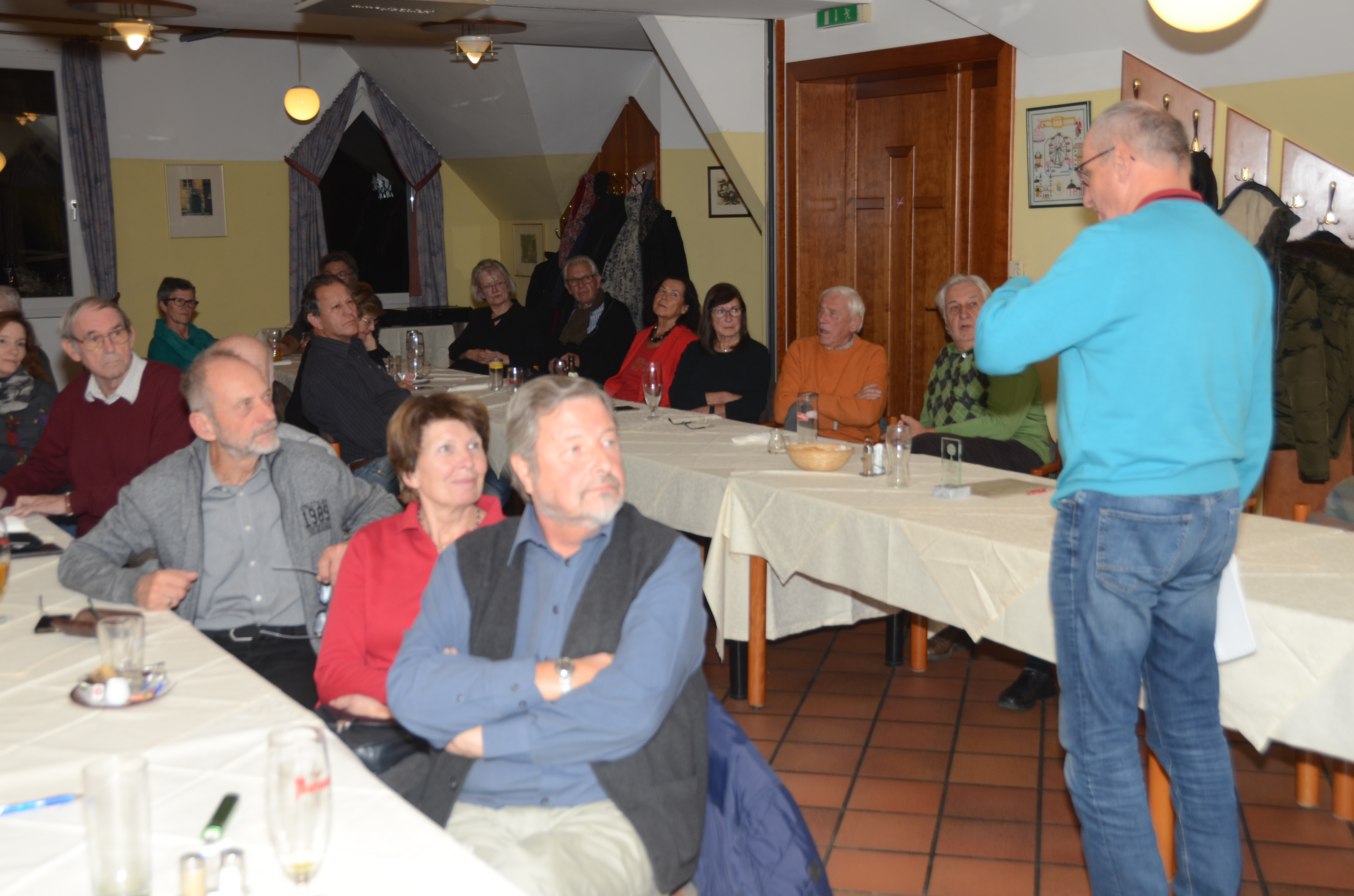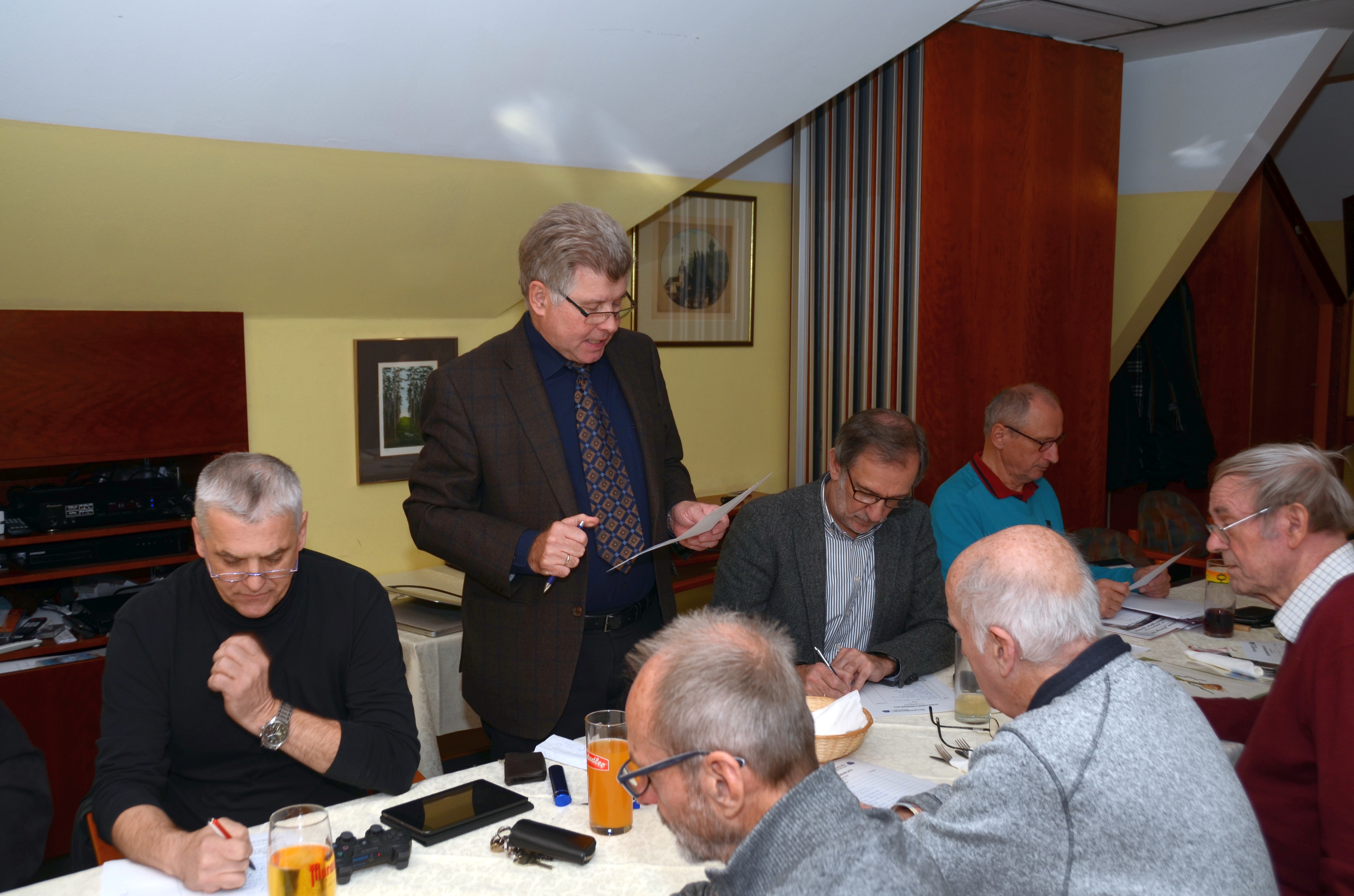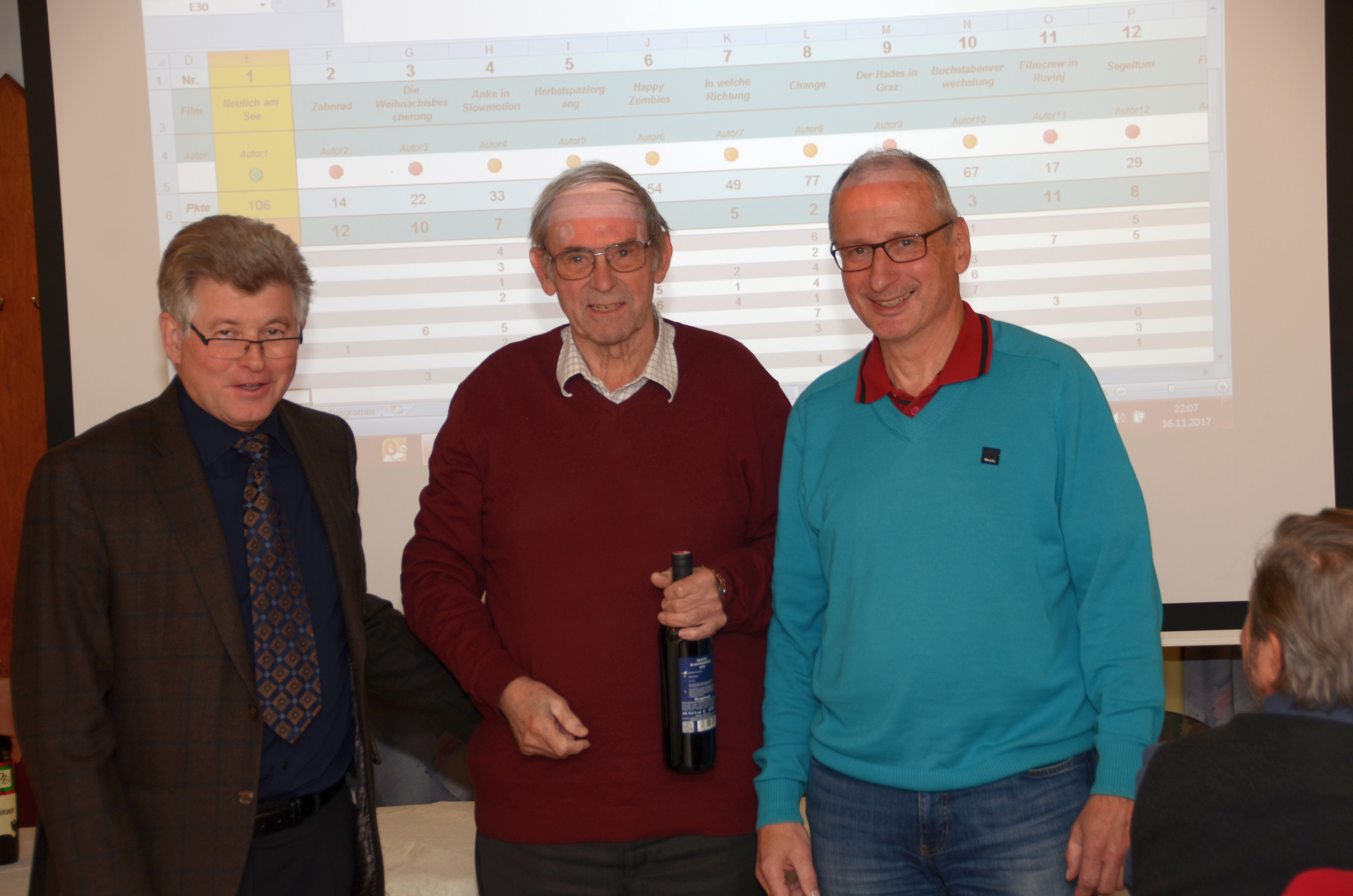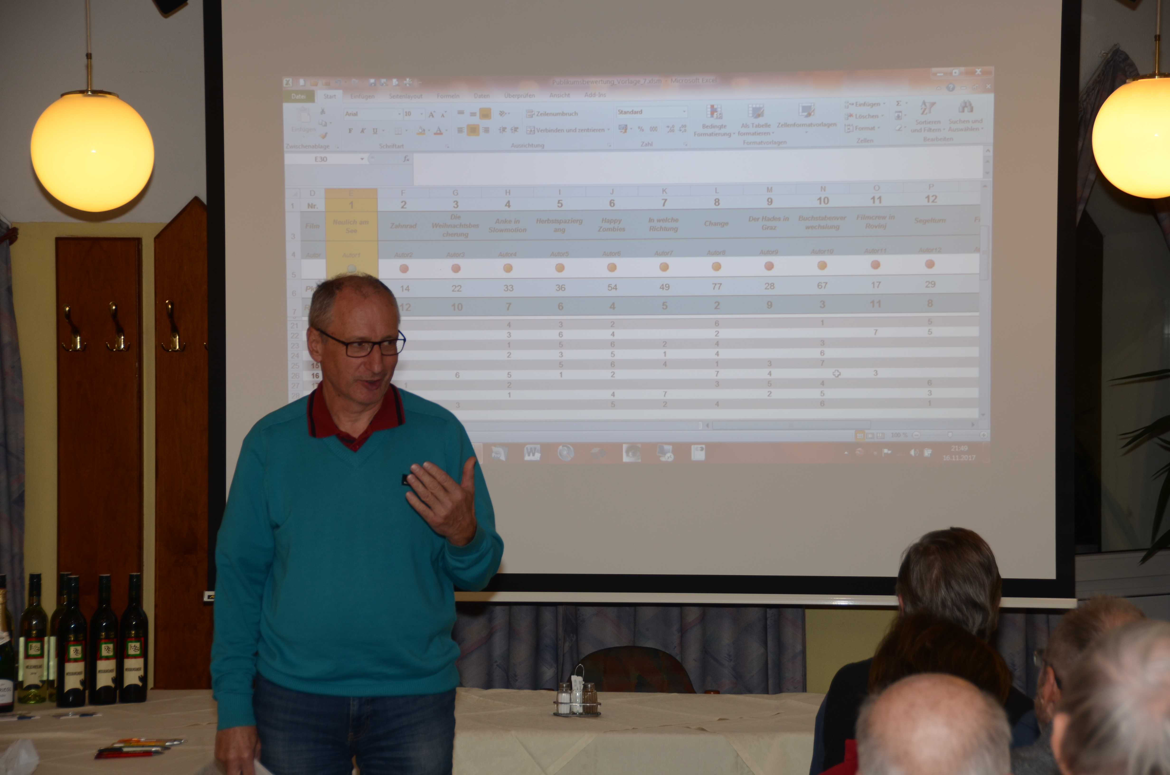 Es hatten sich 18 Clubmitglieder, einige Gäste und als besonders lieber Gast Annemarie Spreitzhofer im Clublokal eingefunden. Bei Rudi Bischoff sind 12 Nennungen eingegangen, die Namen der Autoren waren nur ihm bekannt, die Filme sollten ja anonym vorgeführt werden, also ohne Autor(-en) Vor- oder Nachspann. Die Daten-Sticks mit den Filmen spielte Manfred Strasser in gewohnter Weise in seinen Laptop, Rudi Bischoff loste die Vorführ-Reihenfolge und Michael Moor teilte die Bögen für die Publikumsbewertung aus, dann hieß es Licht aus und die Vorführung begann.