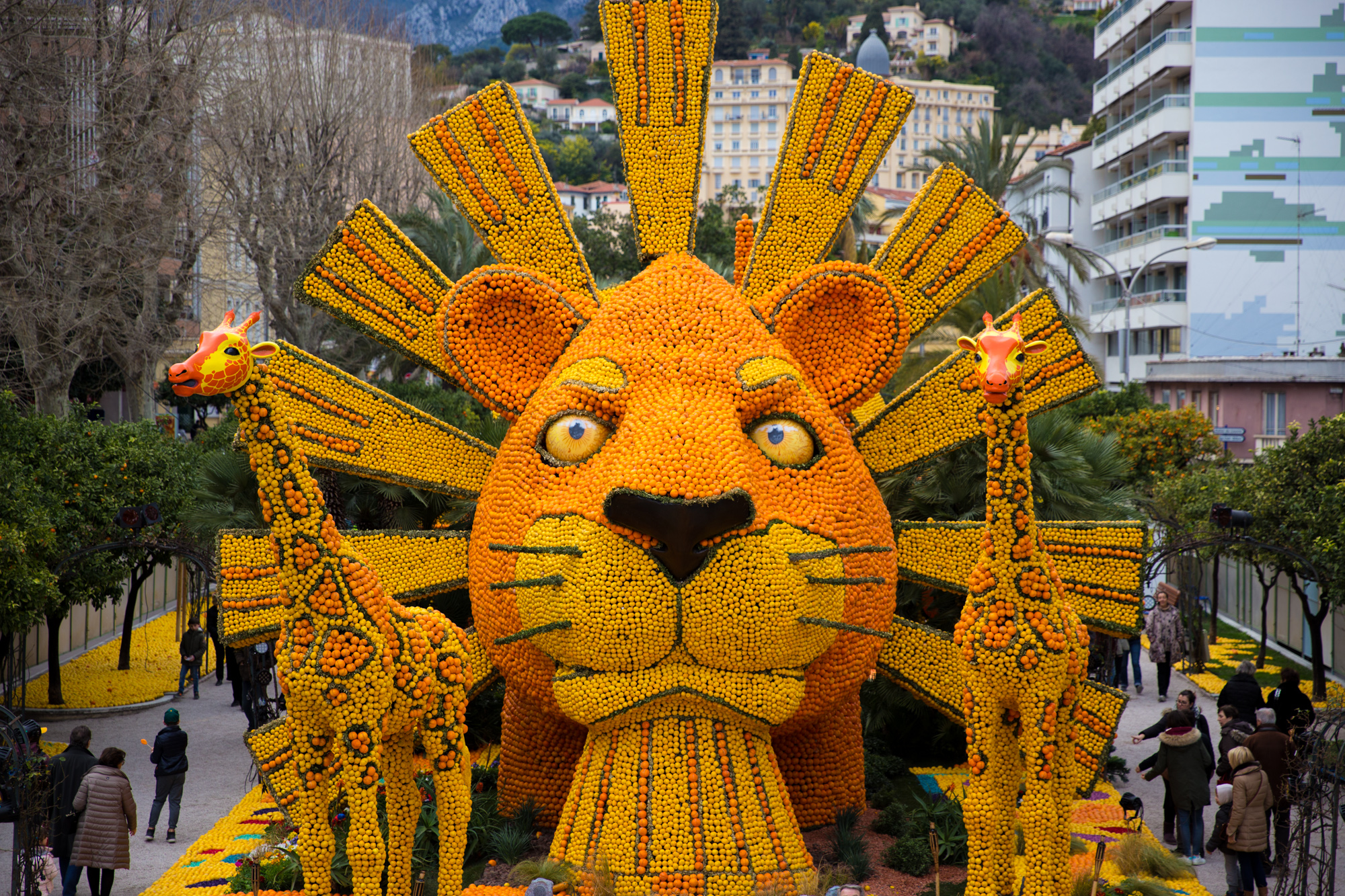 Johannes Neumann: „Zitronenfest Menton – Frankreich“. Aufbauten mit Musical-Darstellungen mit Zitronen und Orangen.