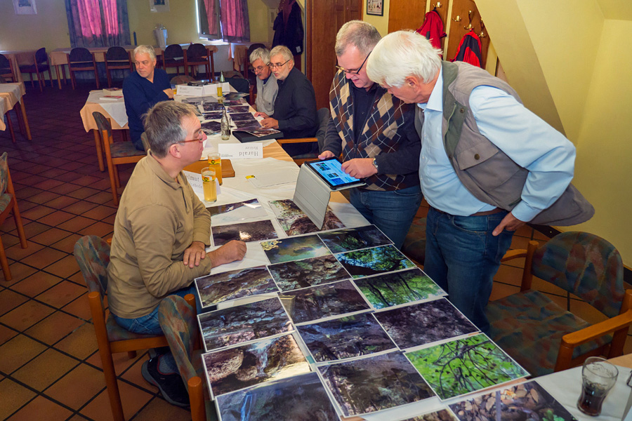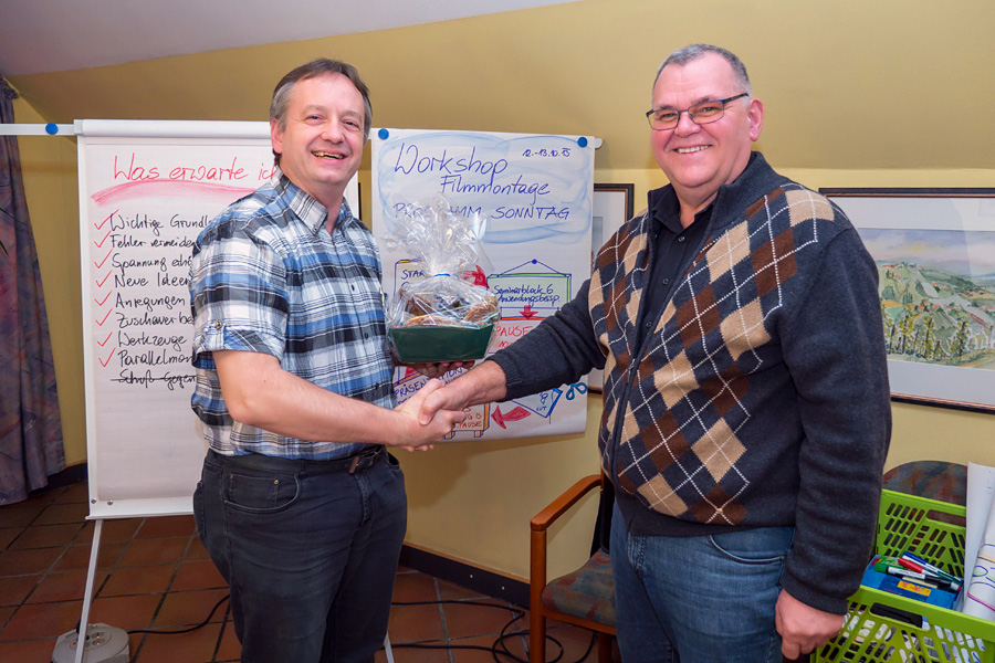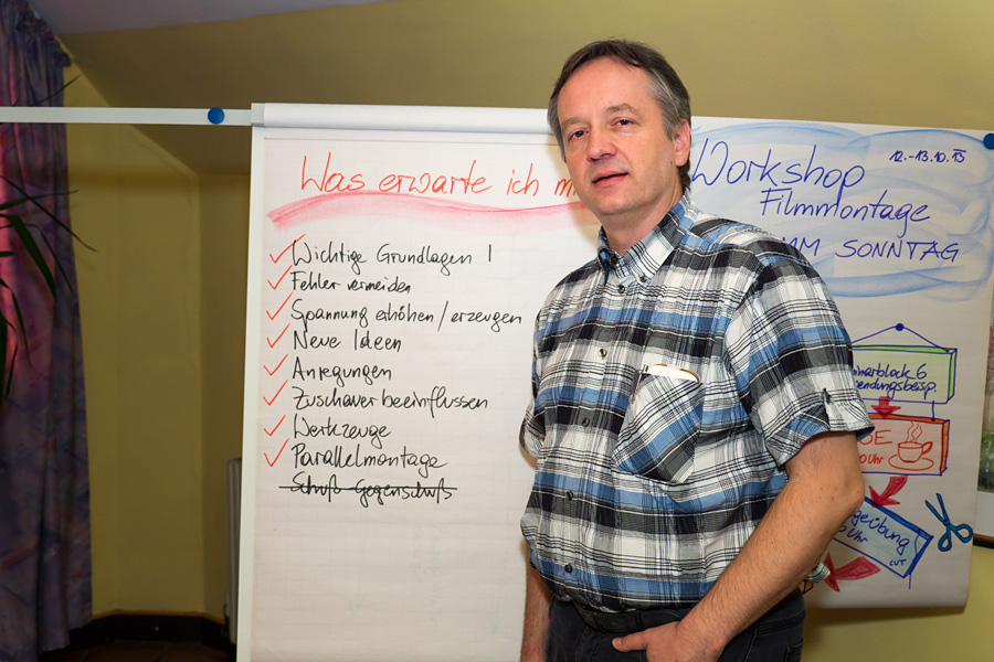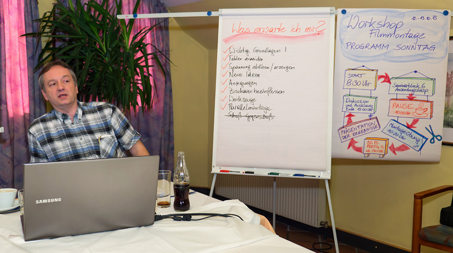 Begriffe wie: – Continuty System“ (Kontinuitätssystem) – Die Macht der Montage – Filmische Spannung, Zeiterlebnis im Film – Ellipse (Handlungsauslassungen) – Der erzählerische Impuls für die Filmmontage – Mythos Achsensprung – Lineare Montage – Rahmenhandlung – Parallel- und Kontrastmontage – Rhythmische Montage – „Compilation Cut“ – und auch der Bruch der „verkrusteten“ Montageregeln sind nur einige, die uns durch die Erklärung und Beispiele näher gebracht wurden. Die obigen Themen sind am ersten Tag als sogenannte Grundlagen vermittelt worden. Der Gelegenheits- und auch der versierte Filmer konnte vieles für sich aufnehmen. Gespannt waren wir am zweiten Tag auf die praktische Übung: eine ungezwungene Trockenübung mit einer Serie von Bildern, die für die unterschiedlichen Einstellungen standen, im Team zu bearbeiten. Dieses Material sollten die drei Gruppen, mit den jeweils gleichen Bildern, zu einen Film – ähnlich wie im Storyboard, zusammenfügen. Die Präsentation musste dann mit den auf einer Schnur befestigten Bildern und einem Kommentar erfolgen. Interessant waren die unterschiedlichen Ergebnisse. Die Kreativität ist grenzenlos.