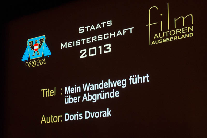 Zur Staatsmeisterin 2013 wurde mit einem Stimmenverhältnis von 3:2 Doris Dvorak mit ihrem Film „Mein Wandelweg führt über Abgründe“ erkoren. In einer Art Spieldokumentation bringt uns der Beitrag das Wirken und Leben Egon Schieles näher. Ein deutscher Student der Schauspielkunst besucht das Leopold Museum in Wien und versetzt sich dabei in die Rolle Schieles, um diesem besser verstehen zu können. Der Film ist sehr genau recherchiert, bringt dem Betrachter den Künstler durchaus näher, bleibt aber in der Bewertung seines umstrittenen Schaffens neutral. Neben seiner dramaturgischen Idee besticht der Film durch seine sehr saubere filmtechnische Umsetzung im Hinblick auf Kameraführung, Lichtsetzung und Musikwahl.