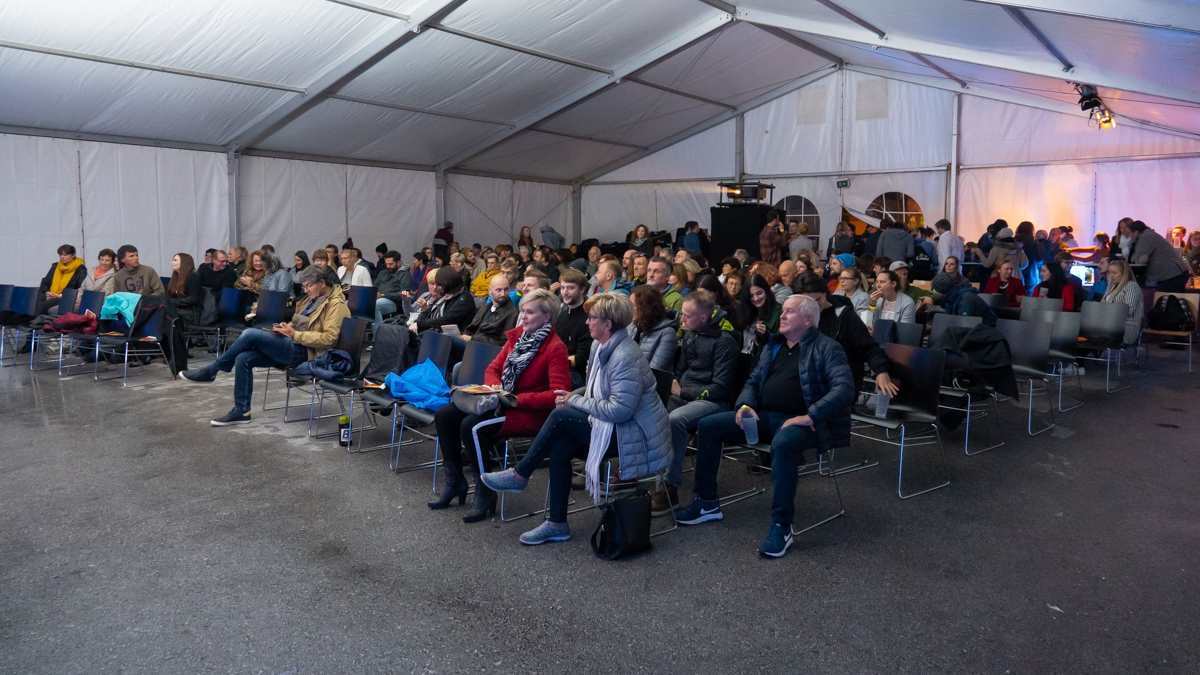 Obwohl die Veranstaltung in einem Zelt stattfindet, haben die Veranstalter alles für ein festliches Flair getan. Vor dem Eingang liegt ein roter Teppich. Eine Fotografin fotografiert die Gäste vor der Sponsorenwand am Red Carpet. Da wir einen Film dabei haben, stehen wir auf der Liste der geladenen Gäste. Zuschauer bezahlen einen Eintrittspreis von € 15.- für beide Abende oder € 10.- für nur einen Abend. Die Veranstalter, im dreiteiligen Anzug mit Fliege, begrüßen die Gäste am Eingang. Heizkanonen vertreiben die ärgste Kälte. Das Zelt ist mit zirka 150 Zuschauern beinahe voll.
